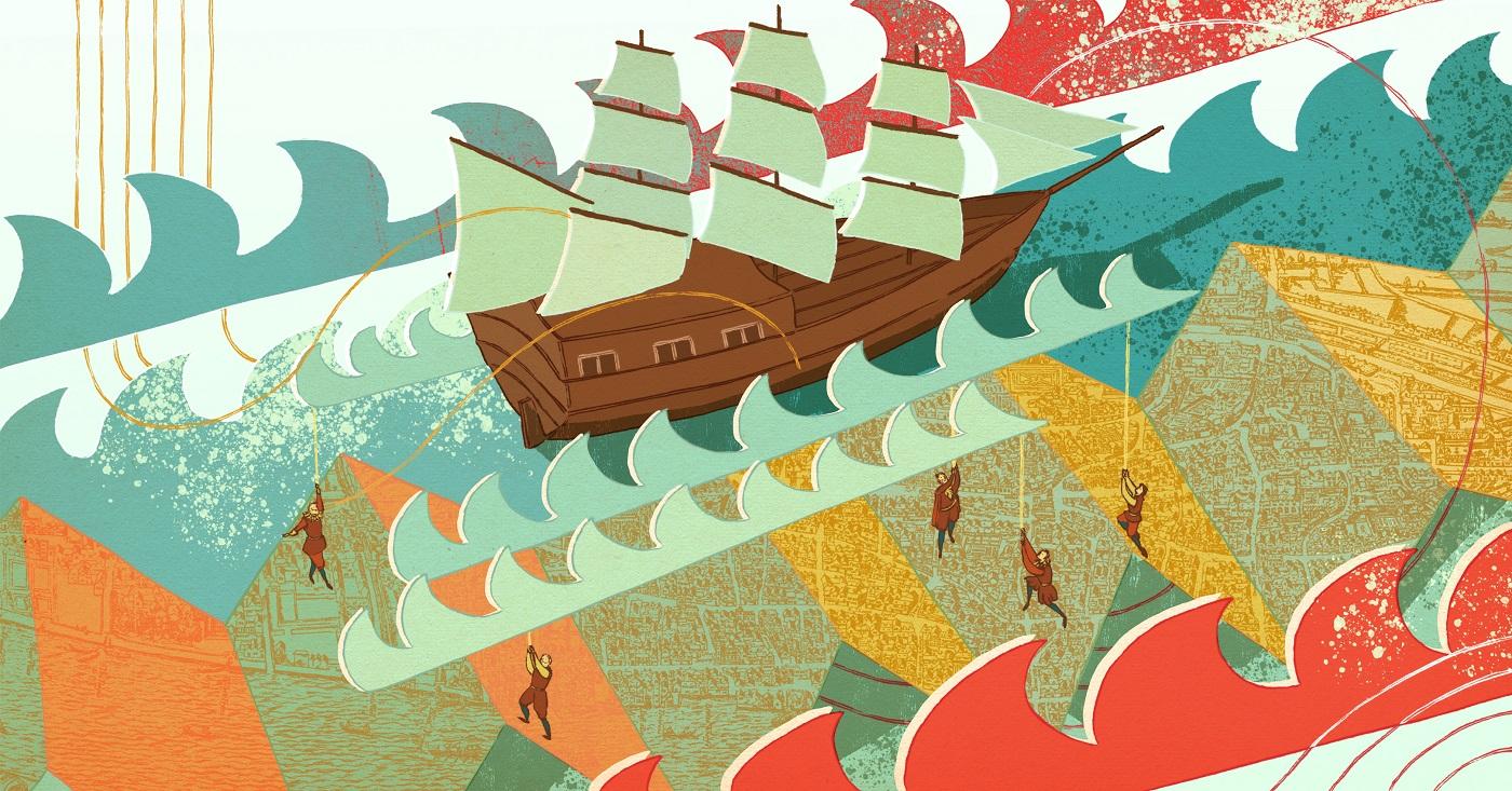 To do this, Cat used a series of central visual metaphors, creating many more rough composition ideas than usual for a project. “I used motifs such as the clothing of the time that indicated wealth and status” she says. “I looked at a lot of ruffs! There was something visually poetic about having the ripples of the fabric flowing into waves of the sea and alluding to the future of colonialism and wealth extraction, with the West Indies seen in the distance.”
