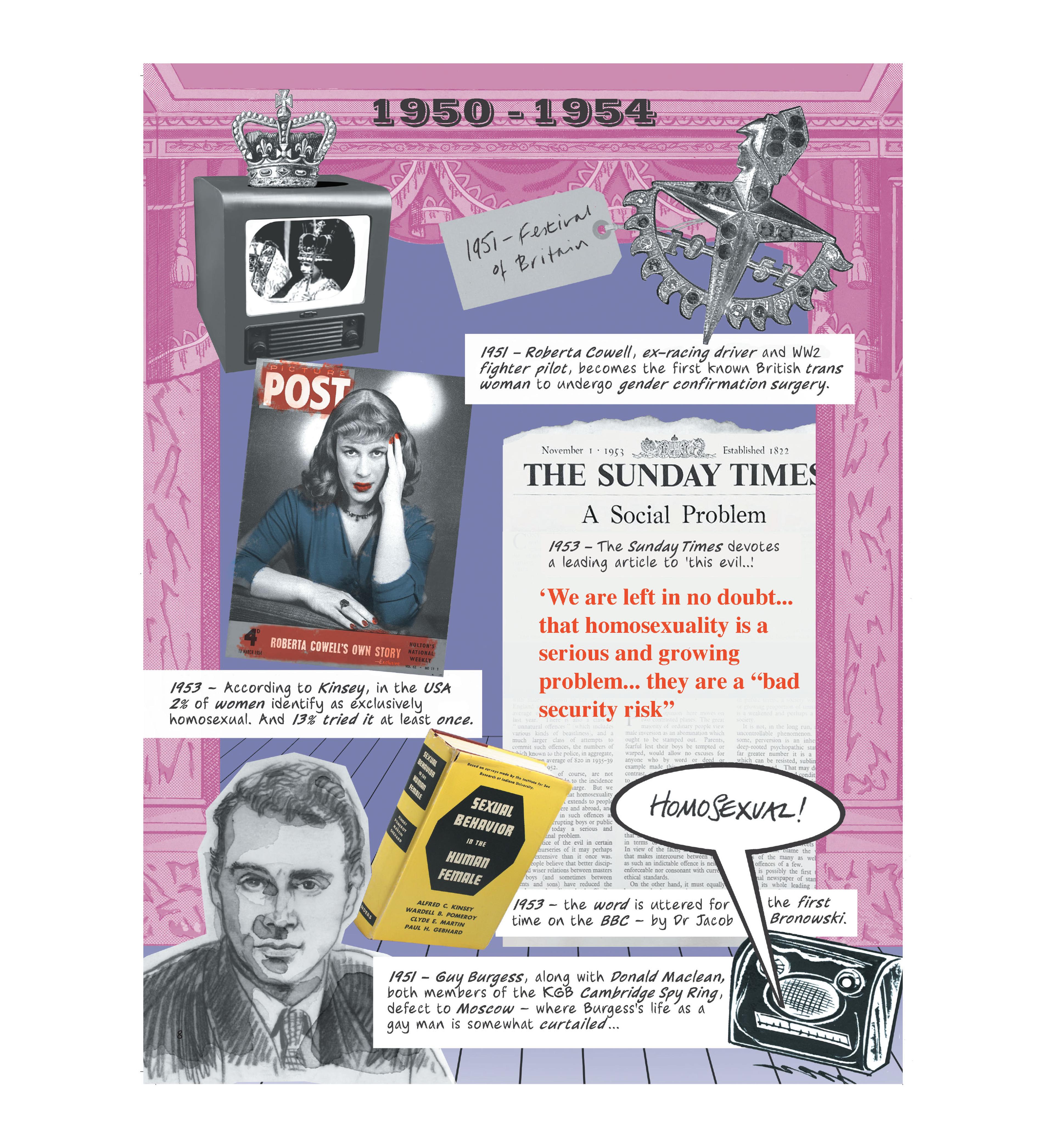 Throughout the book Kate’s collaged history pages illustrate time periods over the last 70 years covering a wealth of LGBTQIA+ history, including the Stonewall Riots, the first Gay Pride march, Section 28, and marriage equality.