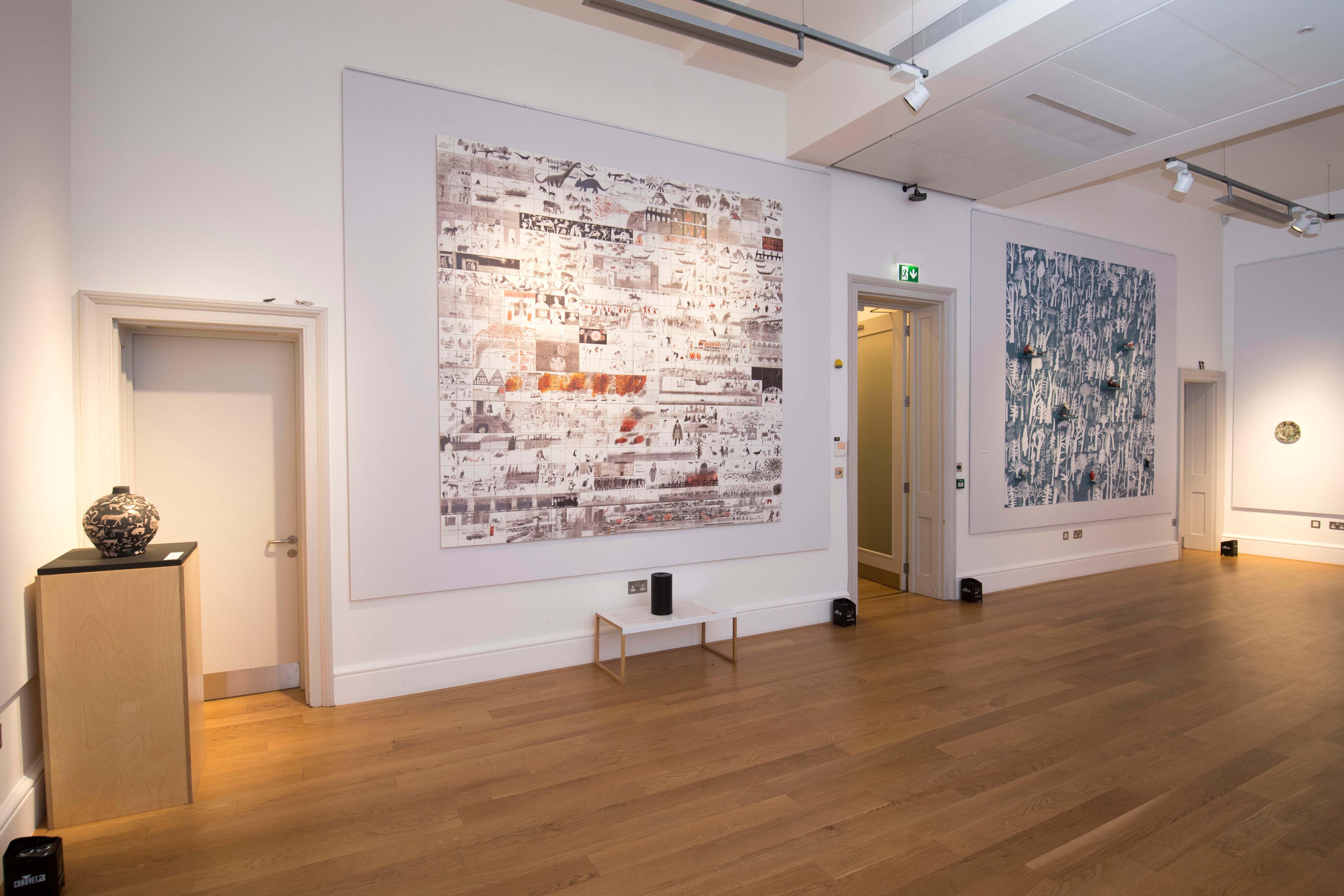 It consisted of five large-scale installations exploring the illustrative possibilities of archetypal ceramic forms such as the vessel, tile, object and plate, including a floor-to-ceiling 650-tile mural of the history of London.