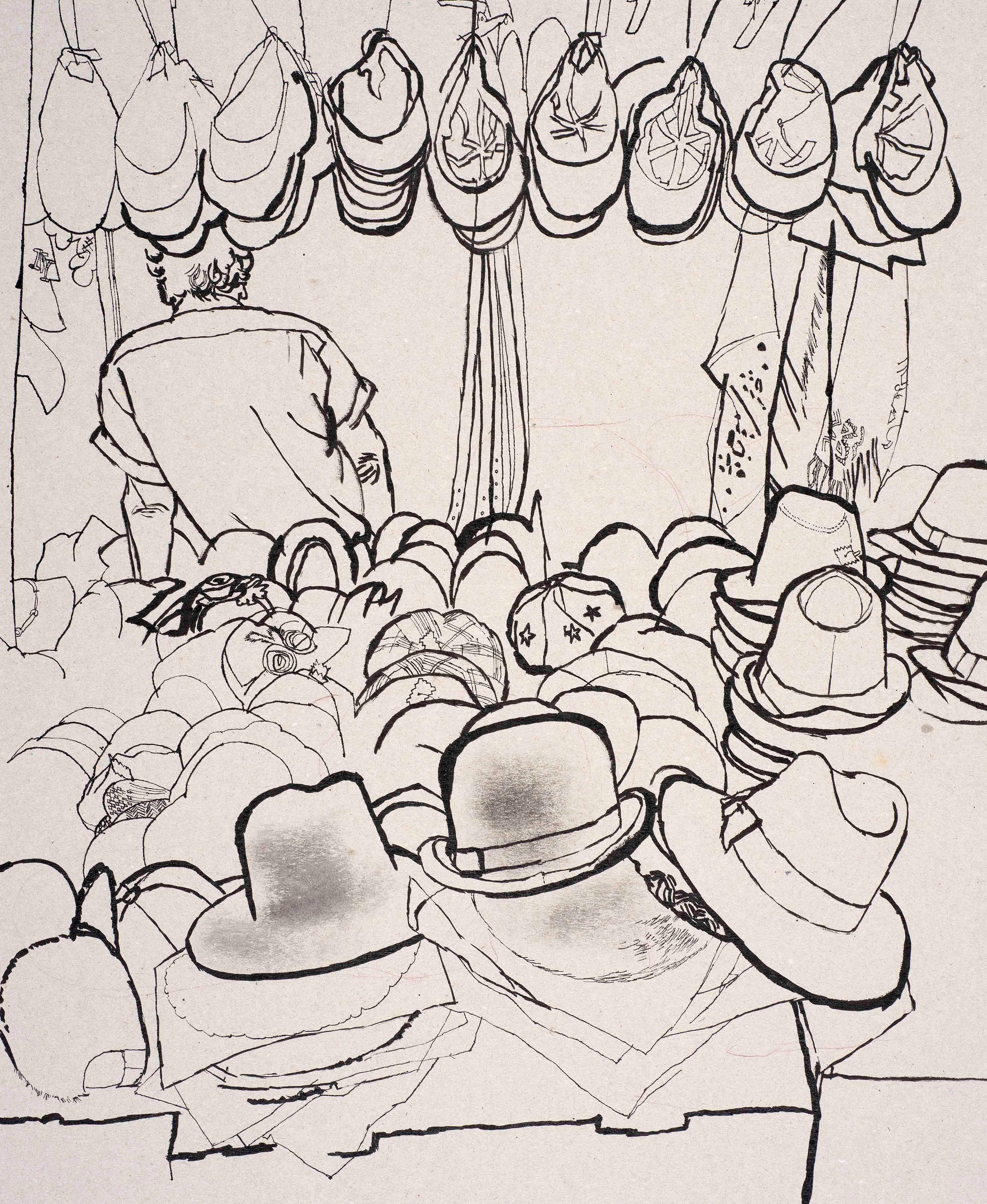 Rogers draws directly from life, capturing intimate details and broad views of cities around the world. This commission explored the relationship between old and new, focusing on the 200 year-old East London market and a new block of luxury flats under construction.