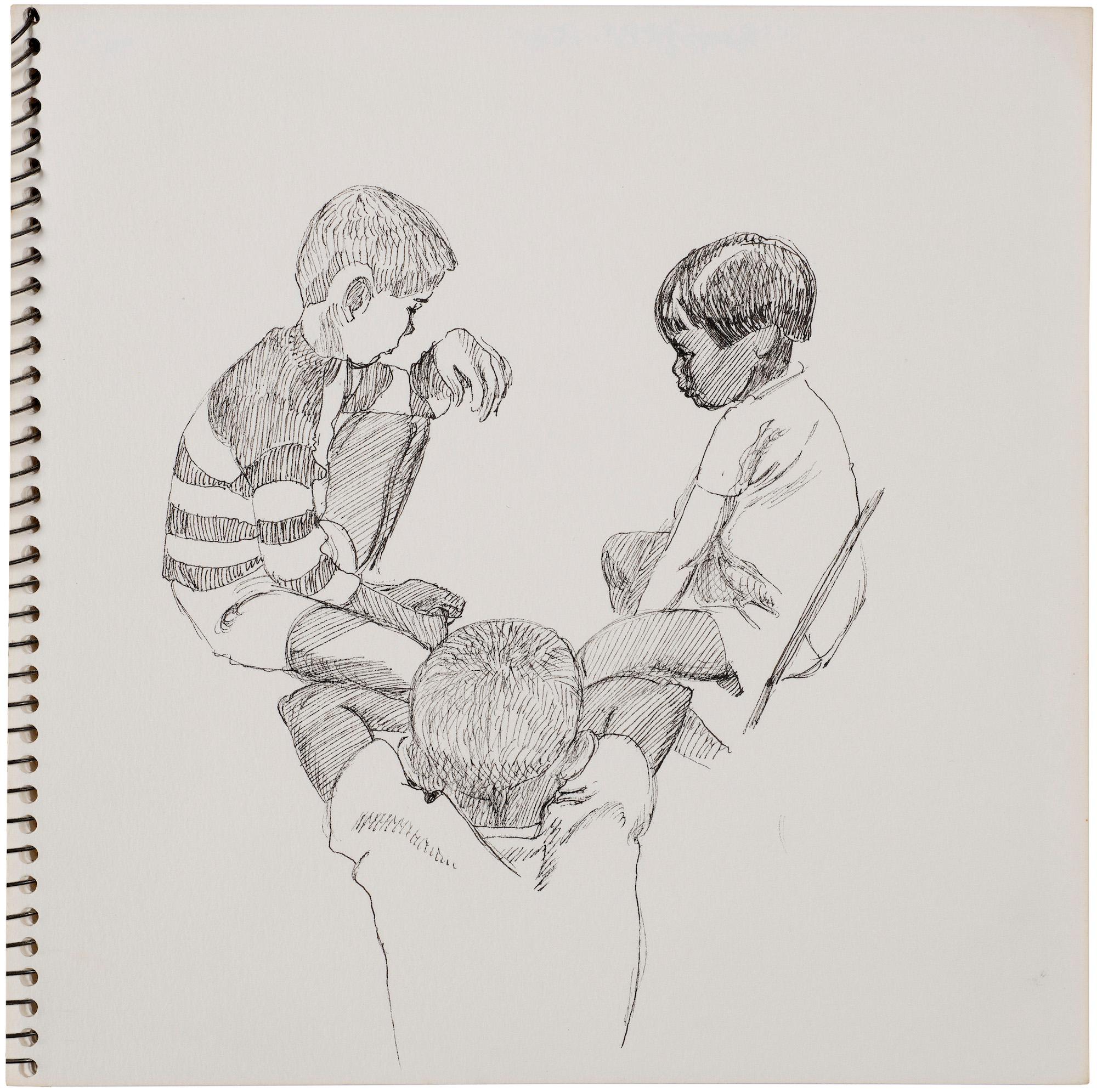 Ayer often used a sketchbook to record her observations and ideas for book narratives and fashion designs. The context for this drawing is unknown.