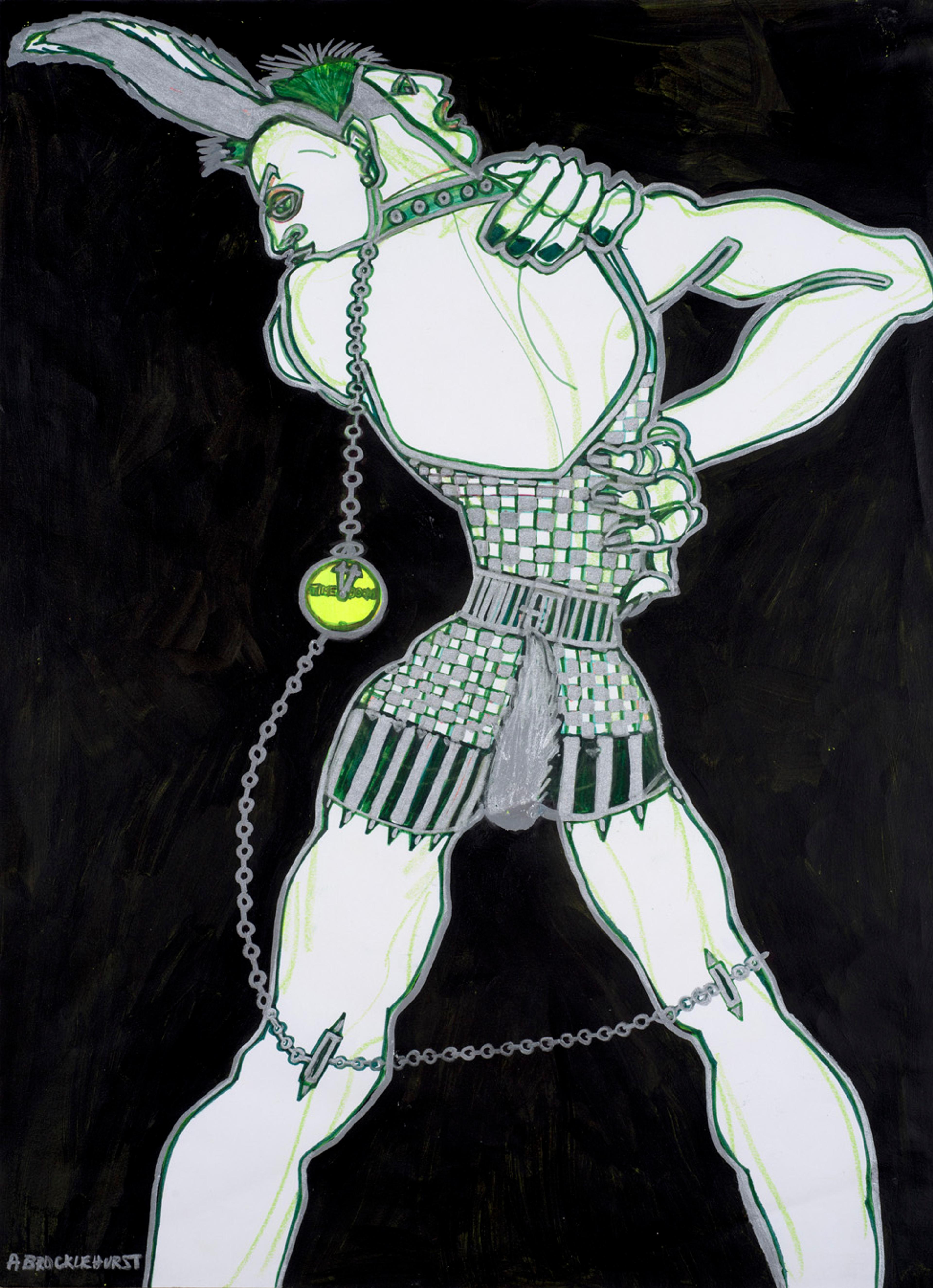 This work is from Brocklehurst Through the Looking-Glass, Brocklehurst’s final series. With an image of herself as a child as the centrepiece, Brocklehurst made hundreds of drawings that re-imagined characters from Lewis Carroll’s Alice novels. Her models were friends and dedicated club-goers who designed and made their own clothes.